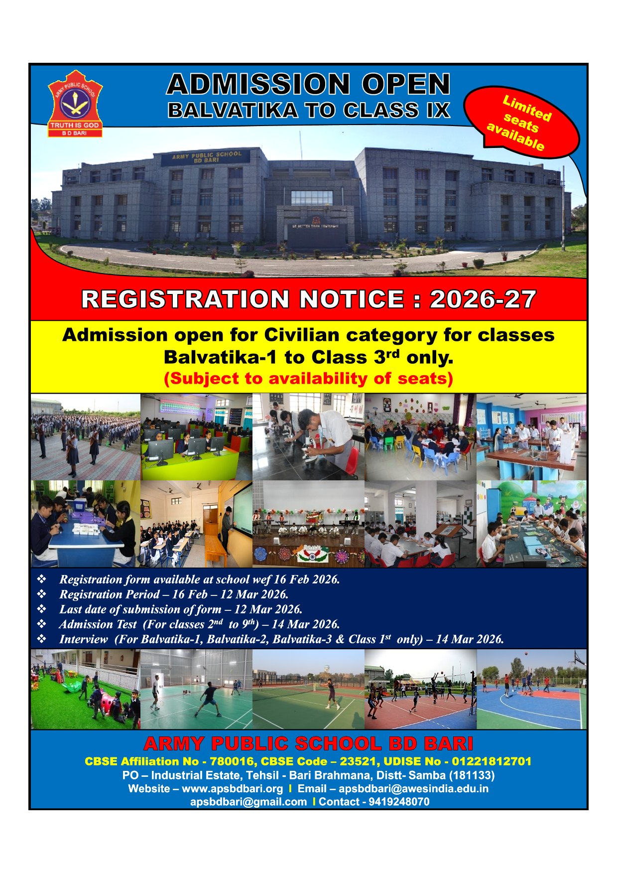 Army Public School BD Bari came into existence in 1989 as a battalion school. It is an English medium co-educational senior secondary institution affiliated to CBSE. On 01 Apr 1994 the school was named as Army School BD Bari. During the academic session 1999-2000 it was upgraded to Secondary School and from 01 Apr 2004 the school was further upgraded to Senior Secondary School. On 1st July 2011 the school was re-designated as Army Public School. The stunning surroundings of our school not only inspire a sense of wonder but also serve as a canvas for learning, where students are encouraged to explore, discover, and connect with the natural world around them.